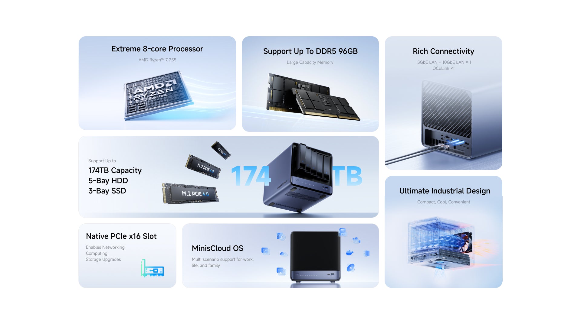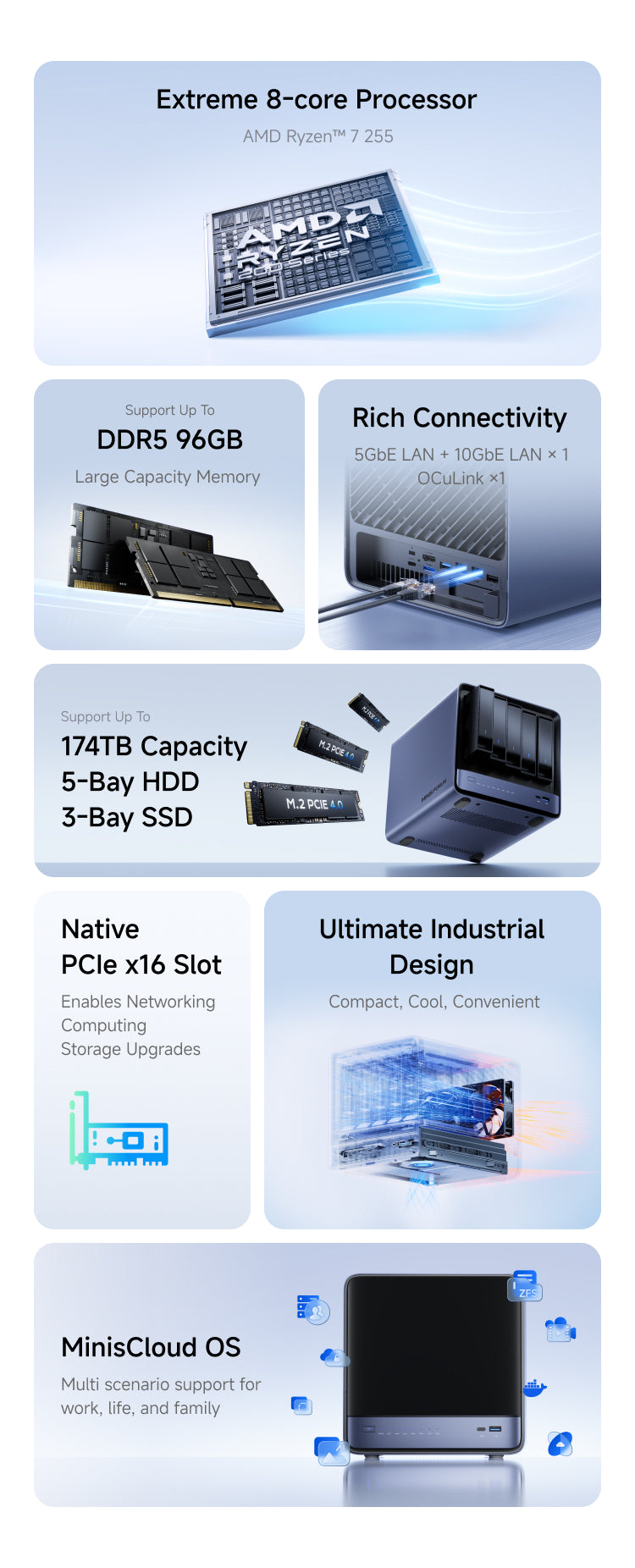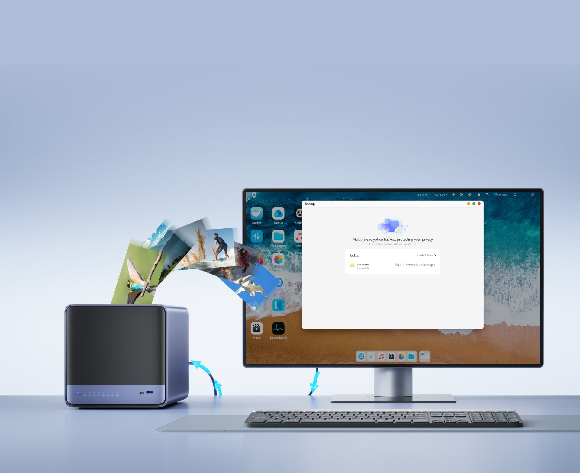 Las funciones integradas incluyen instantáneas ZFS, compresión LZ4, aislamiento multiusuario, aplicaciones Docker, álbumes de fotos con inteligencia artificial y acceso remoto con un solo clic, todo gestionado y listo para usar.