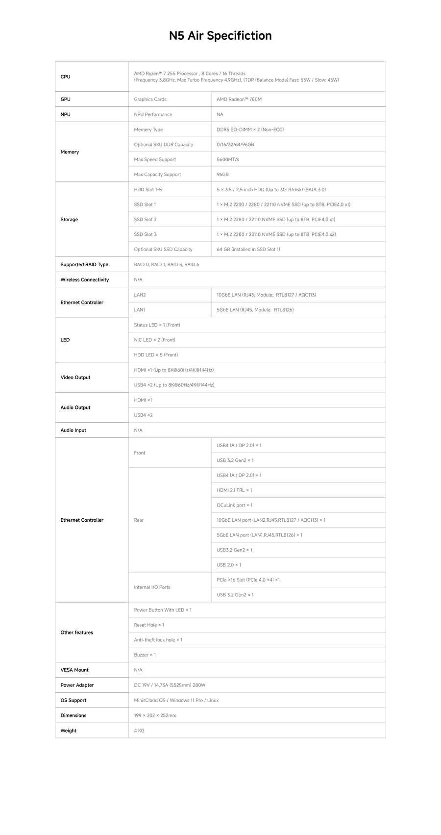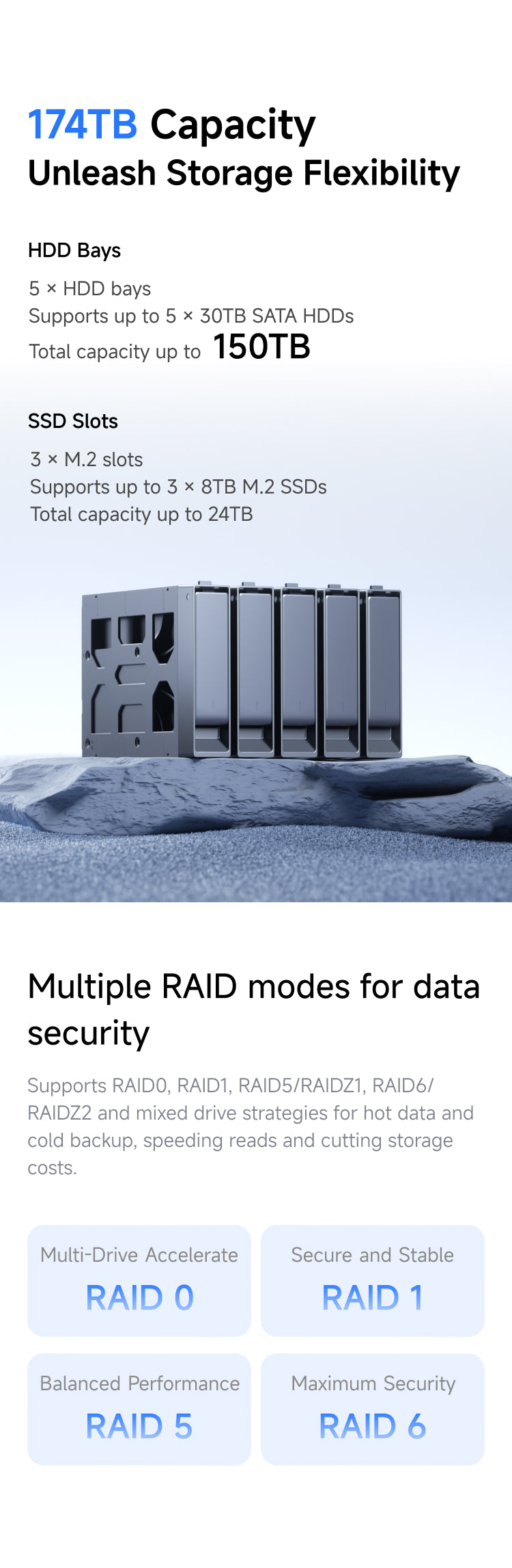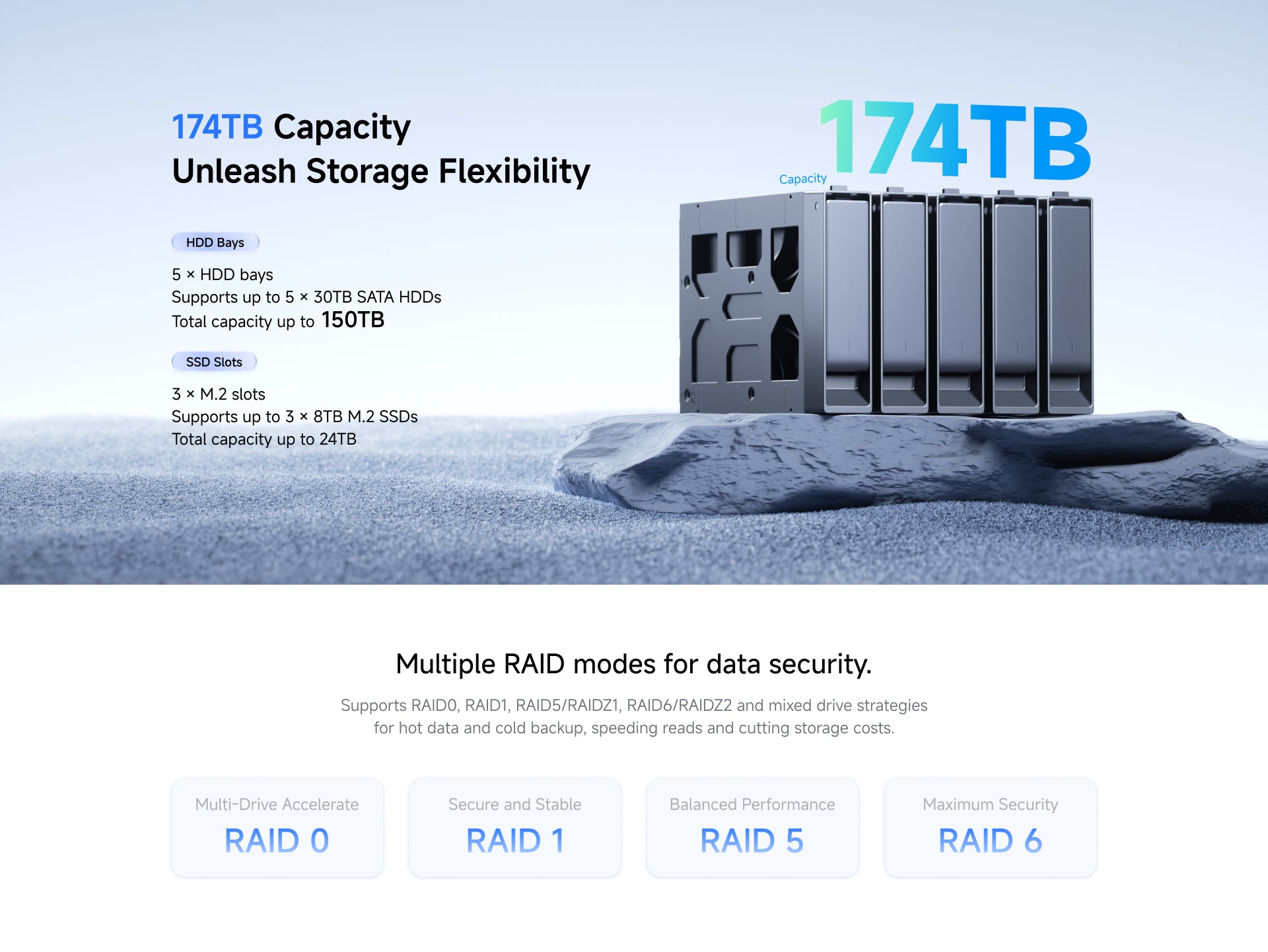 Soporta RAID 0/1/5/6 con estrategias de almacenamiento flexibles, equilibrando rendimiento y seguridad.
