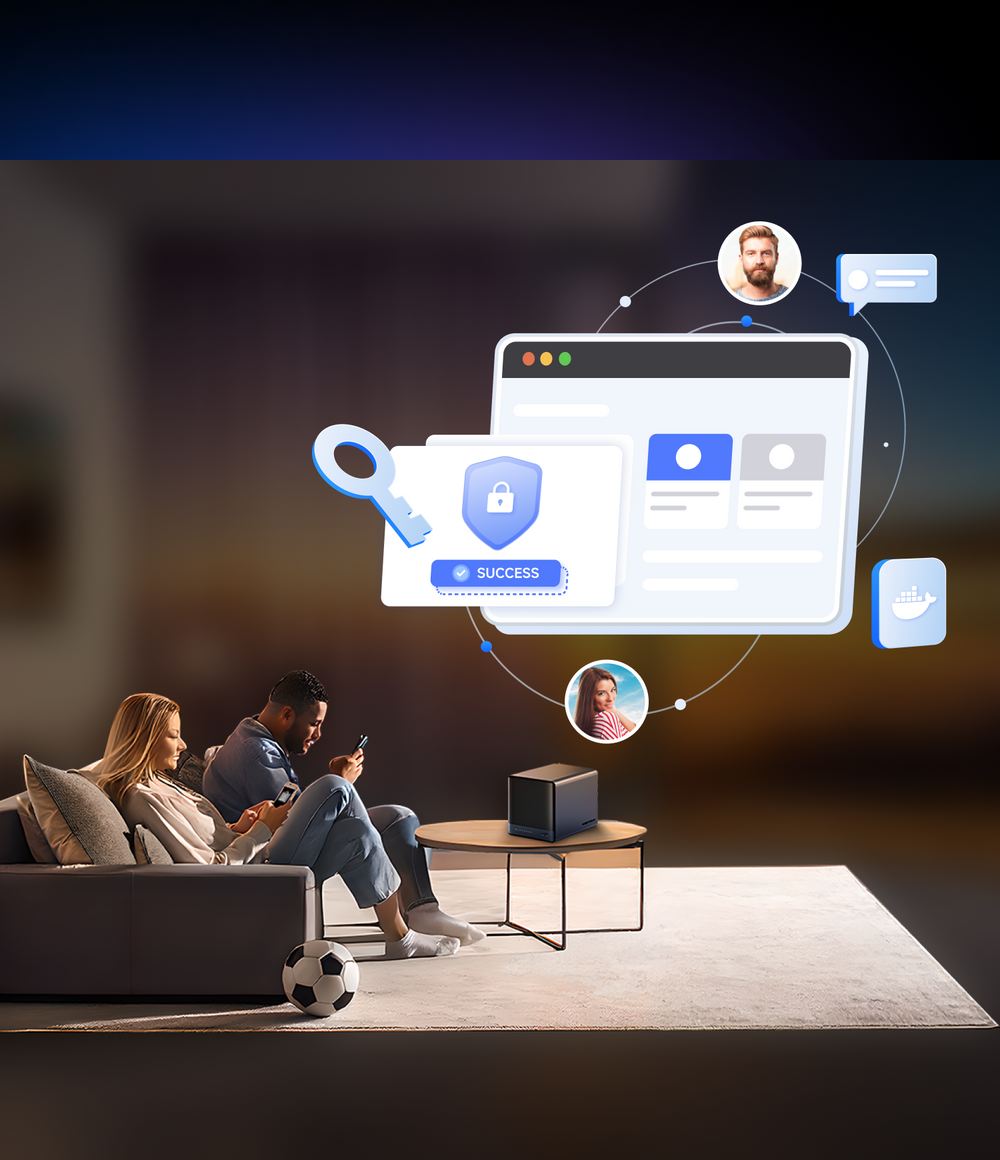 Built-in features include ZFS snapshots, LZ4 compression, multi-user isolation, Docker apps, AI photo albums, and one-click